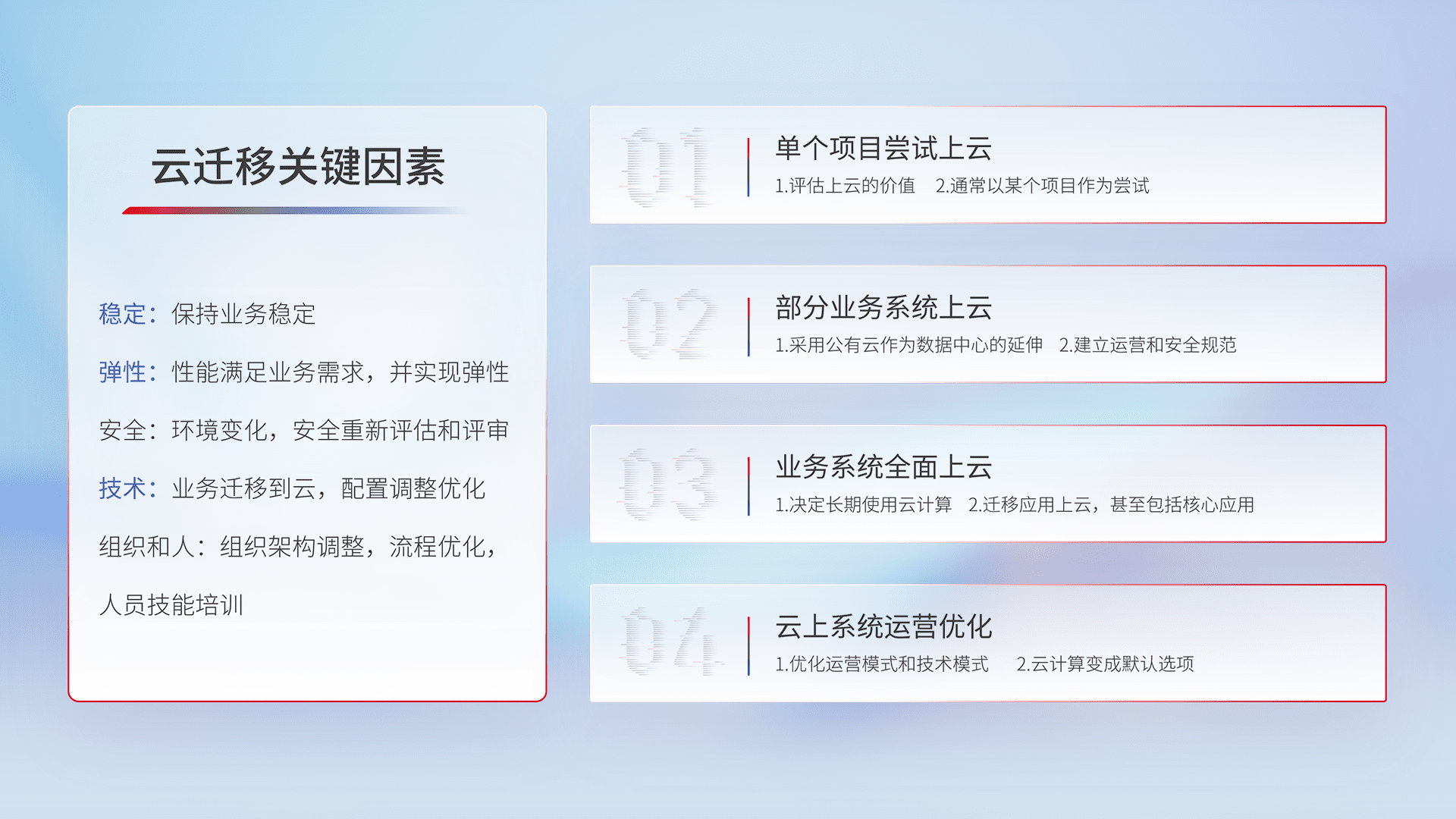 结合实际业务,,从规划设计、、、云平台选型、、、云原生改造、、、、数据迁移、、、集成交付,,,,迁移全过程为客户识别最佳上云路径,,做好风险识别管理,,,,设计网络架构、、、身份权限、、安全审计合规、、、操作审计、、日志审计、、、、监控告警策略、、、、多站点容灾设计等,,,对云上基础设施进行整体规划,,提升IT治理水平,,以满足弹性、、、、高可用、、高性能的需求。。。。